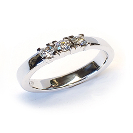 Dette er en kraftig og elegant alliansering i hvittgull. 4 Solide klør som holder diamanten litt opp fra selve ringen gir en ekstra fin virkning. Her er det satt inn 3 diamanter i rekke.