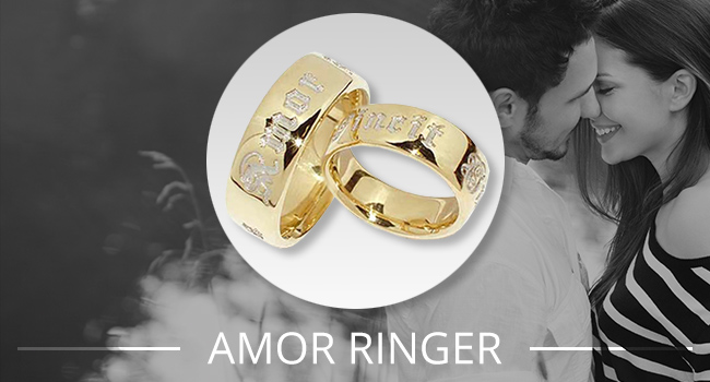 Amor-ringene AMOR VINCIT OMNIA «Kjærligheten overvinner alt» Forlovelsesringer i Hvitt gull.. Orginalringene fra Smykkesenteret