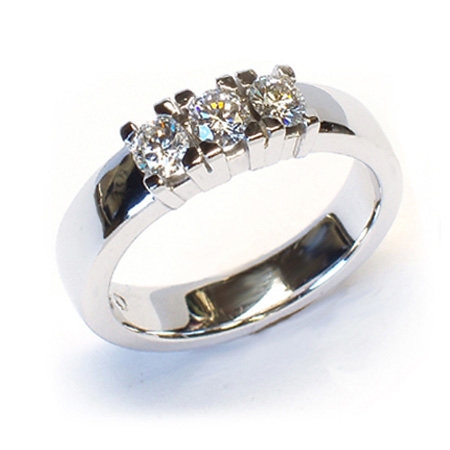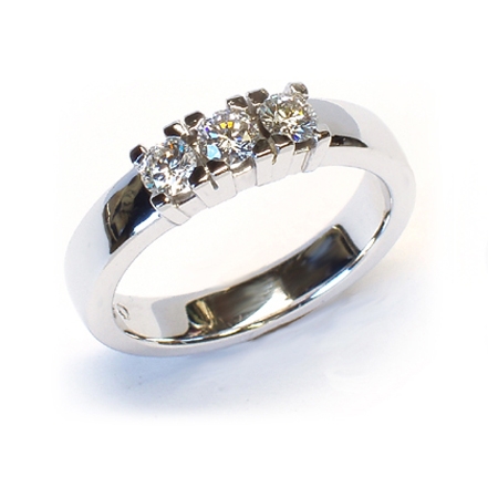 Dette er en kraftig og elegant alliansering i hvittgull. 4 Solide klør som holder diamanten litt opp fra selve ringen gir en ekstra fin virkning. Her er det satt inn 3 diamanter i rekke.
