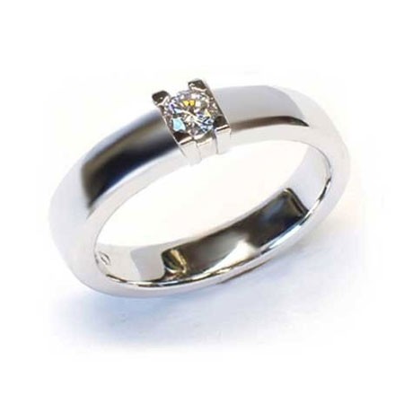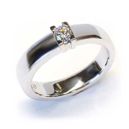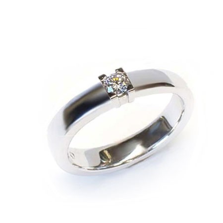 Dette er en kraftig og elegant alliansering i hvittgull. 4 Solide klør som holder diamanten litt opp fra selve ringen gir en ekstra fin virkning.