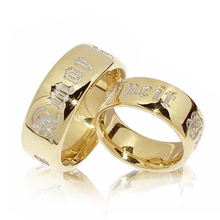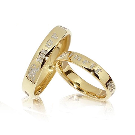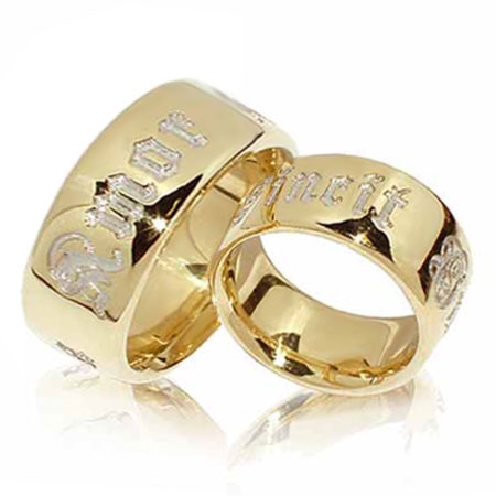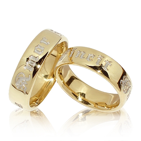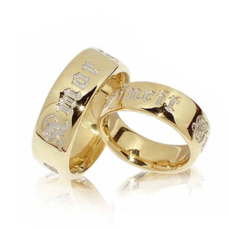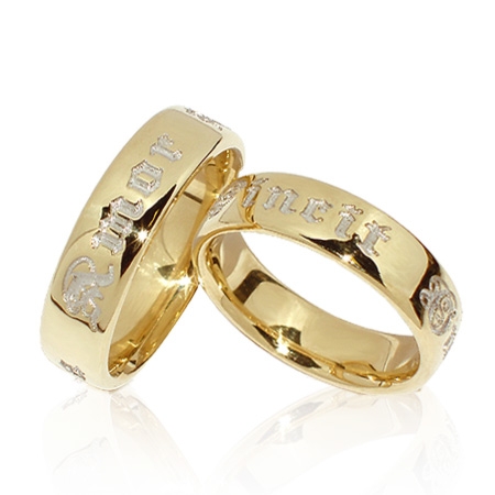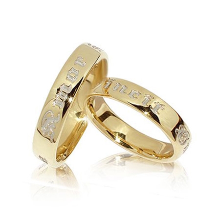 Amor-ringene AMOR VINCIT OMNIA «Kjærligheten overvinner alt» Forlovelsesringer/gifteringer i Gult gull. Orginalringene fra Smykkesenterets eget verksted.