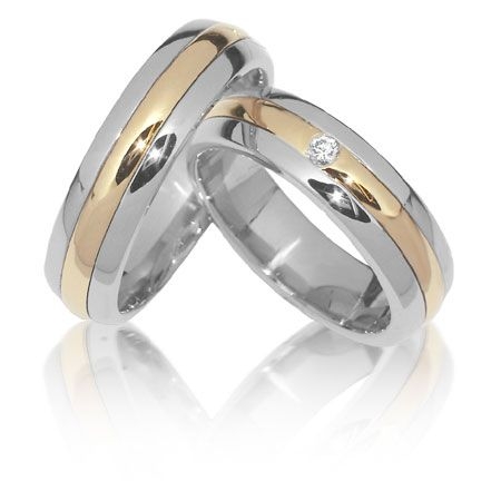 Nydelige tykke hvittgull ringer i solid utførelse med gultgullstripe i midten.